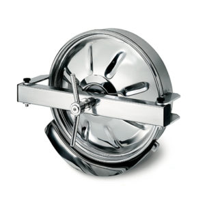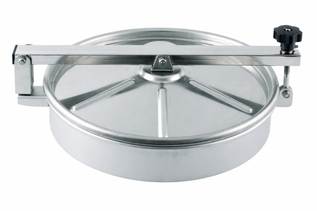 AISI 304 / 316L oraz komplet elementów: kołnierz (rama), pokrywa, uszczelka, pokrętło i ramię.